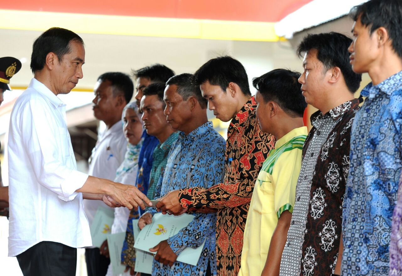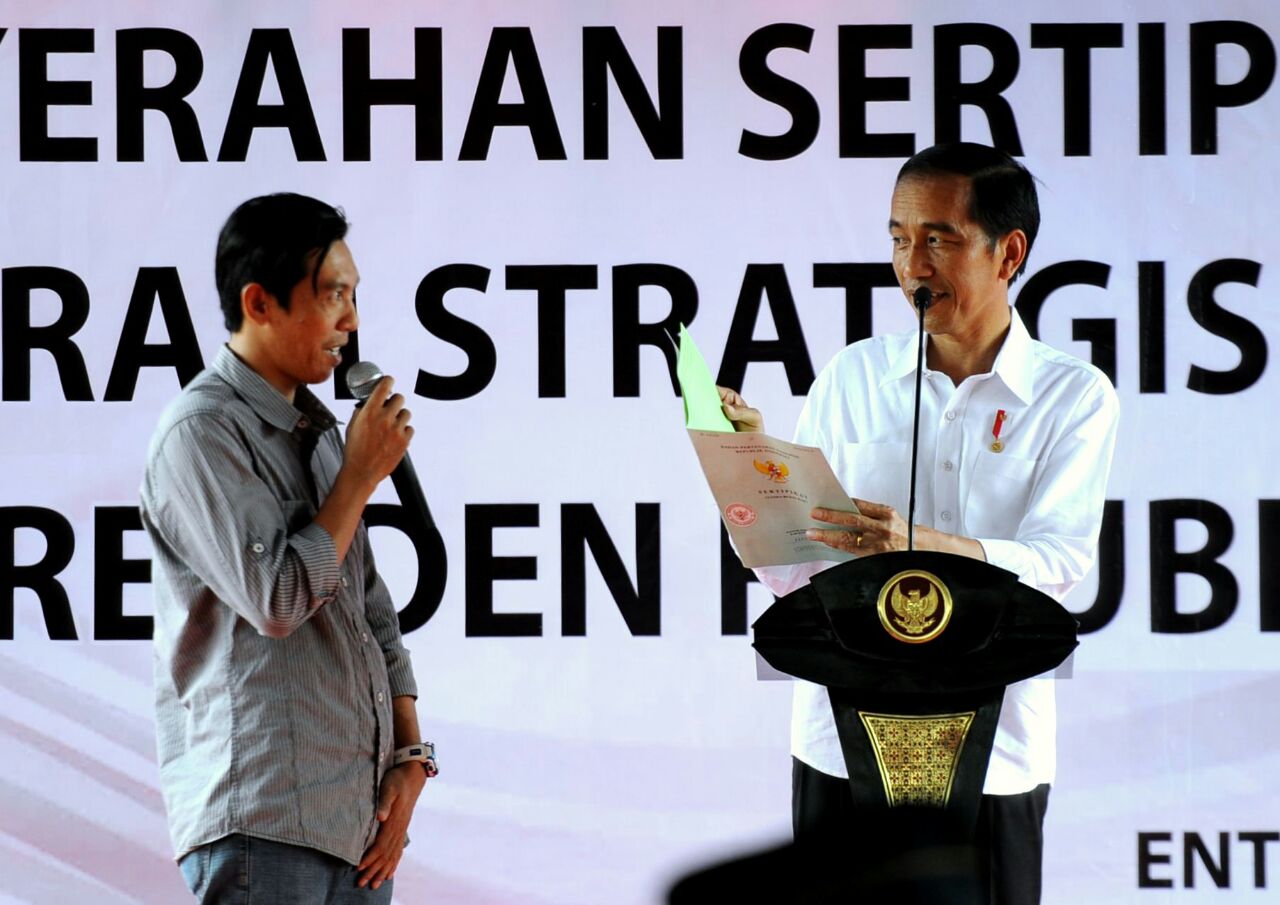 Presiden Joko Widodo menyerahkan sertifikat tanah program strategis tahun 2016 di Kantor Camat Entikong, Kabupaten Sanggau, Provinsi Kalimantan Barat. FOTO : BIRO PERS SETPRES