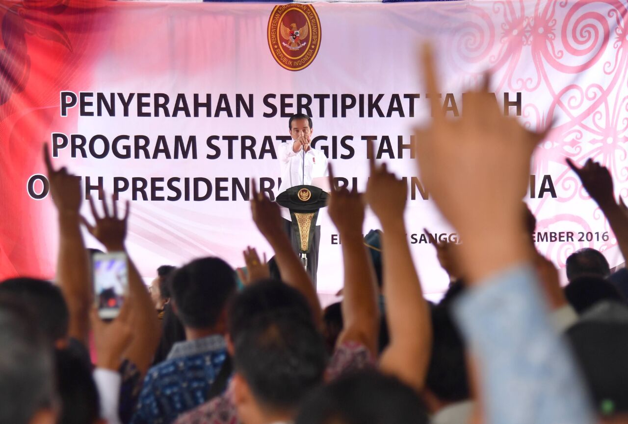 Presiden Jokowi menyerahkan sertifikat tanah program strategis tahun 2016 untuk digunakan hal produktif oleh masyarakat di Kabupaten Sanggau, Kalimantan Barat. FOTO : BIRO PERS SETPRES