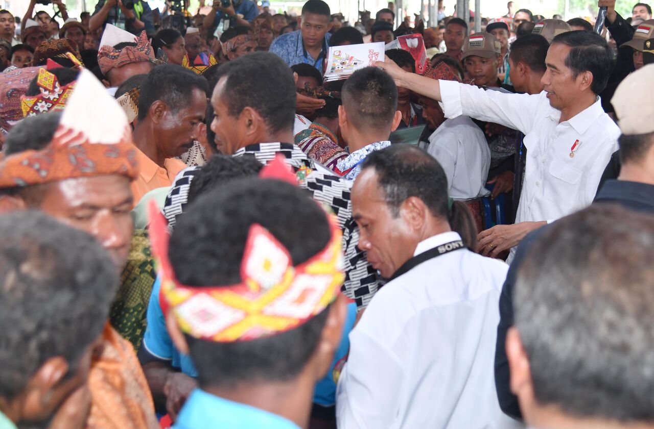 Presiden Joko Widodo menyerahkan sertifikat tanah program strategis tahun 2016 kepada pemilik sertifikat tanah di Lapangan Sepakbola Desa Silawan, Kabupaten Belu, NTT, Rabu 28 Desember 2016. FOTO : VIBIZMEDIA.COM/RULLY