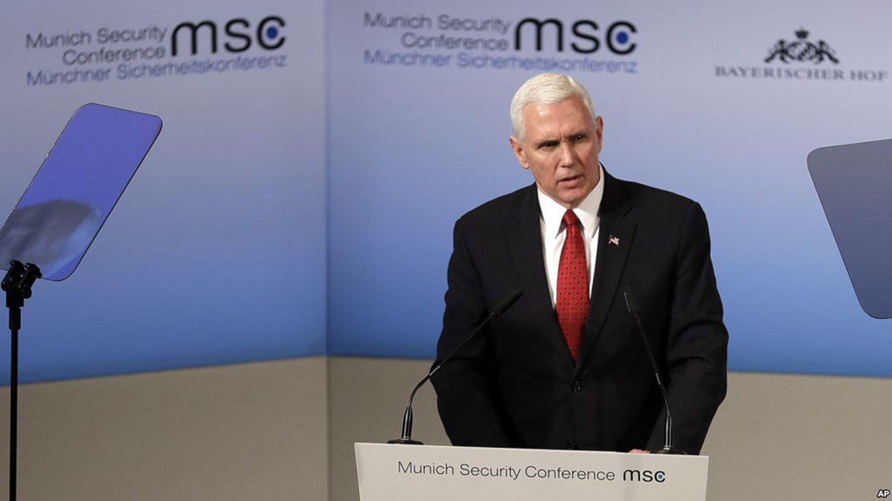 Pence berusaha memberi jaminan kepada para sekutu bahwa Amerika mendukung NATO setelah ucapan oleh Presiden Amerika Donald Trump mengenai kekagumannya pada Presiden Rusia Vladimir Putin dan kecamannya mengenai NATO pada masa ketidakpastian sedunia seperti sekarang ini. Pemerintah negara-negara Eropa telah khawatir oleh ucapan Trump itu.