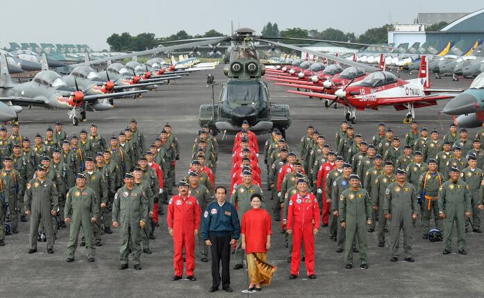 Dalam peringatan tersebut, Presiden Joko Widodo bersama Ibu Negara Iriana Jokowi yang baru saja tiba dari kunjungan kerjanya di Boyolali, Jawa Tengah berkesempatan berfoto dengan 152 pilot pesawat tempur TNI AU.