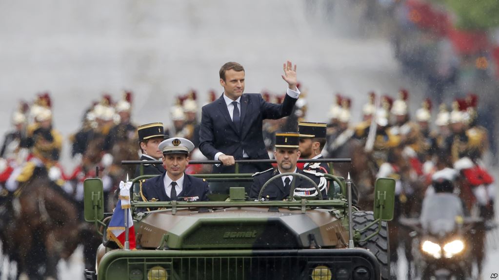 Dalam pidato pelantikannya hari Minggu, Macron mengatakan akan melakukan apa saja yang diperlukan untuk memerangi terorisme dan kediktatoran dan menyelesaikan krisis migran dunia. Ia juga menyebut “kapitalisme yang berlebihan di dunia” dan perubahan iklim termasuk diantara tantangannya di masa depan. “Kita akan melakukan tanggung jawab kita untuk memberi, setiap saat dibutuhkan, tanggapan yang sesuai terhadap krisis kontemporer yang besar” katanya.