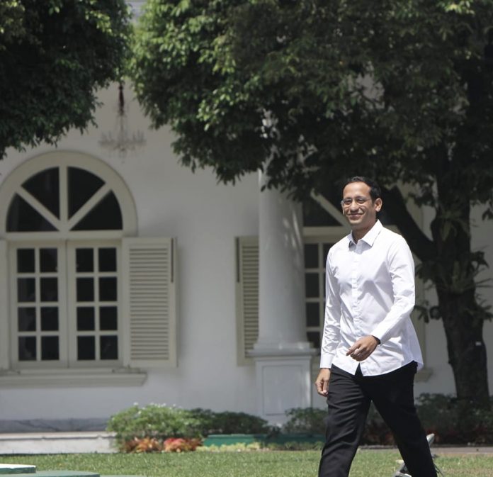 Tak berselang lama, Nadiem Makarim tampak berjalan memasuki halaman depan Istana Negara. Sama halnya dengan Mahfud MD, ia datang dengan mengenakan kemeja putih. Ia pun sempat menyapa awak media sebelum masuk ke dalam Istana.