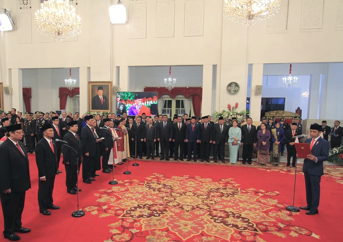 Presiden Joko Widodo kemudian memimpin pengucapan sumpah jabatan para menteri dan pejabat setingkat menteri periode tahun 2019-2024.
