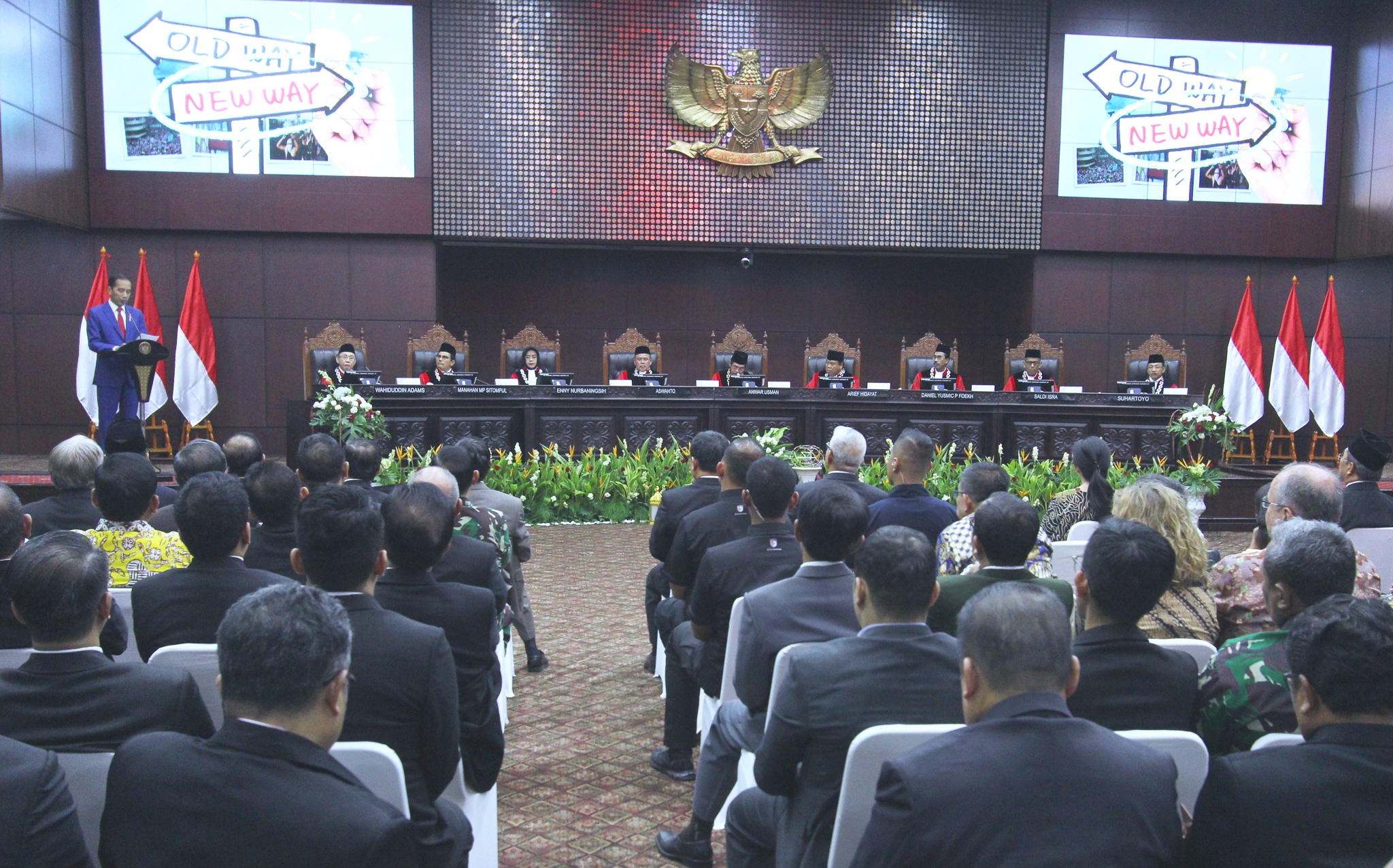 Presiden Joko Widodo memberikan sambutan dalam acara Penyampaian Laporan Tahunan Mahkamah Konstitusi Tahun 2019 di Mahkamah Konstitusi, Medan Merdeka Barat, Jakarta Pusat, pada Selasa, 28 Januari 2020. FOTO: VIBIZMEDIA.COM|MARULI SINAMBELA