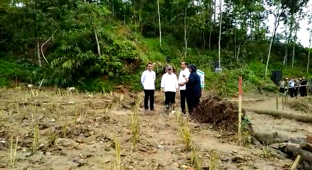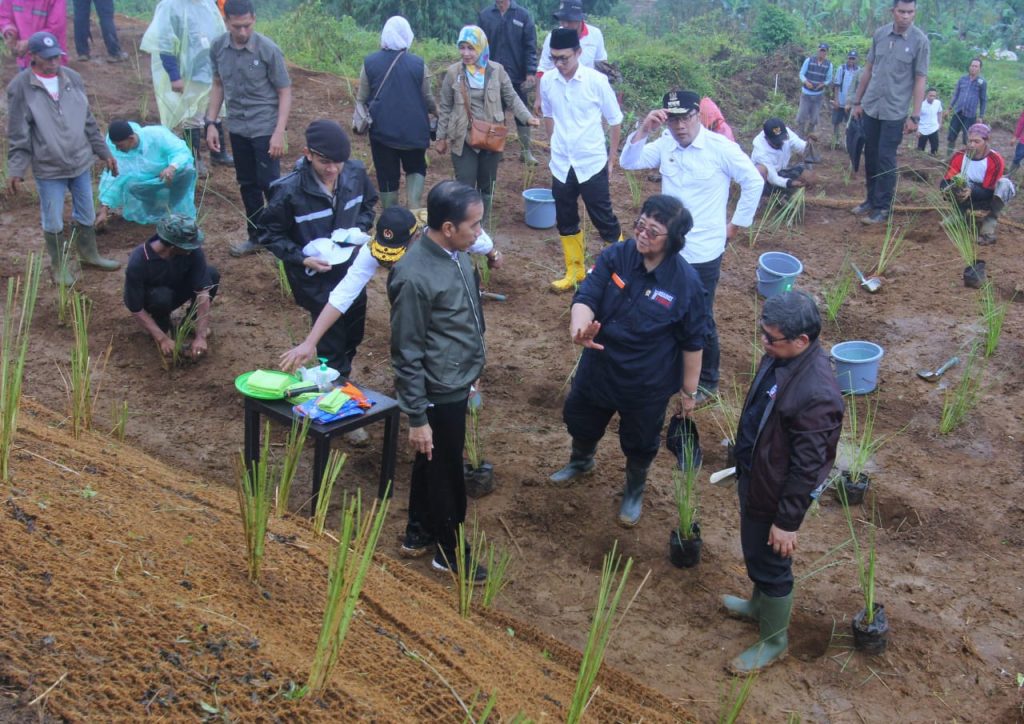 Bersama rombongan Jokowi menyempatkan meninjau penanaman vetiver yang dilakukan di sekeliling lereng yang mengitari Desa Harkat Jaya.