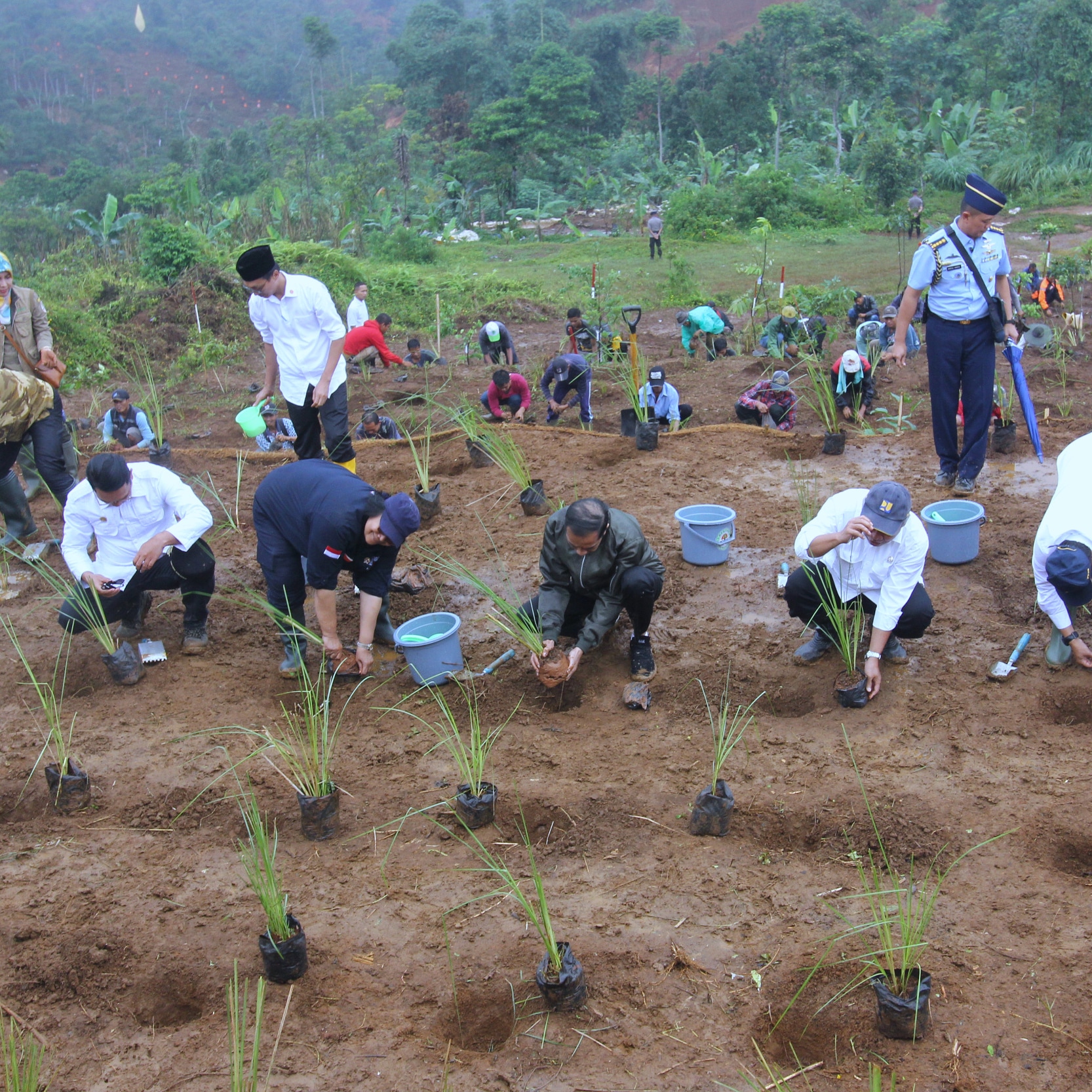 “Dan hari ini kita mulai. Yang ditanam bukan hanya vetiver tapi ada buah-buahan durian, jambu, jengkol dan lain-lain,” lanjut Presiden.