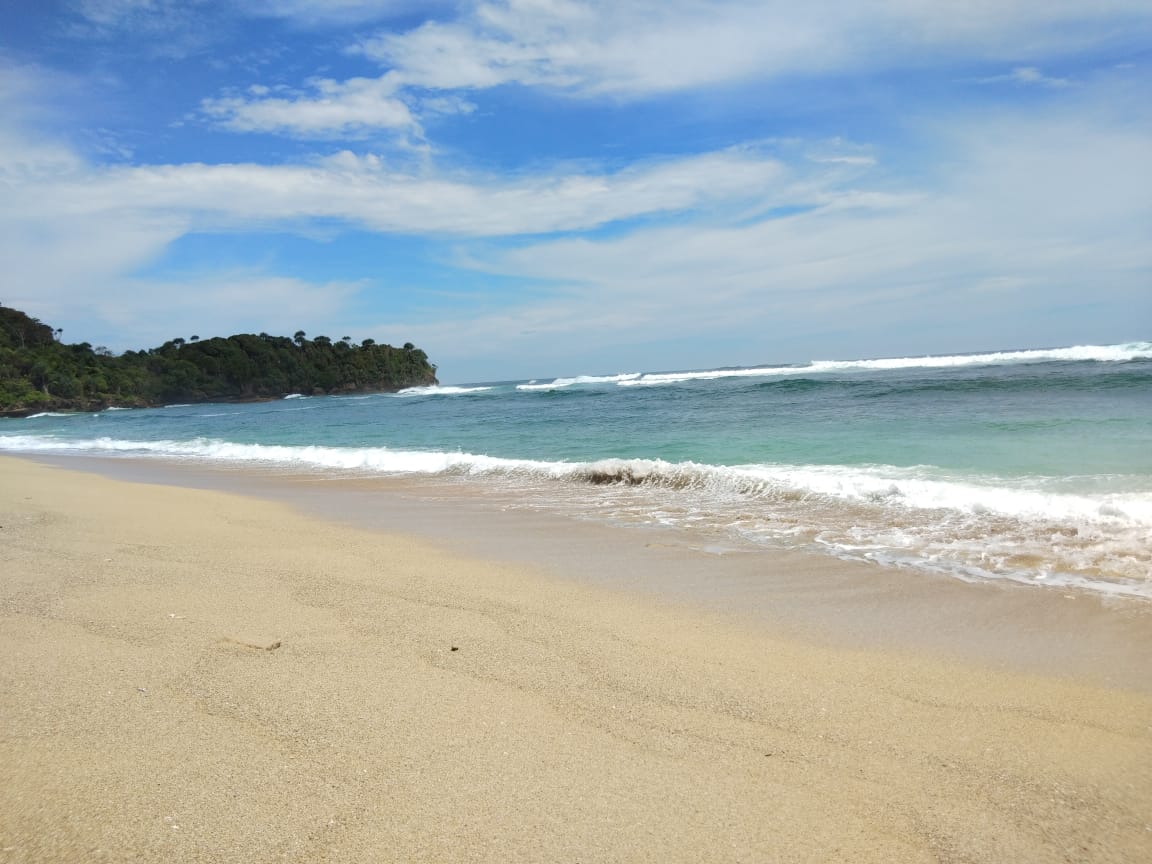 Kita akan langsung disuguhi pemandangan indah dari pasir putih yang cantik dan luas. Ombak memang relatif cukup besar karena berbatasan langsung dengan Samudera Hindia. Tapi mendengarkan suara ombak berdebur kencang menjadi kenikmatan tersendiri.