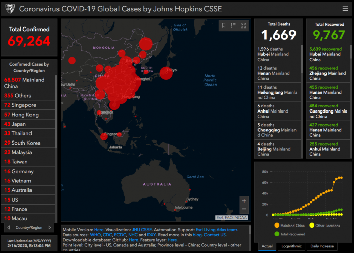 (Vibizmedia-Headline) Suatu lonjakan luarbiasa terjadi dalam beberapa hari ini. Jikalau sebelumnya diberitakan bahwa jumlah kasus yang dikonfirmasi adalah 45.000 kasus maka pada hari ini sudah mencapai lebih dari hampir 70.000 kasus Wuhan Coronavirus. Tepatnya 69.264 kasus terkonfirmasi dengan angka kesembuhan sebanyak 9767 orang (14,1%). Singapore memiliki jumlah kasus terbanyak di luar China (72), diikuti oleh Hongkong (57). Angka kematian di luar China bertambah satu dengan kematian di Jepang. Sebuah situs online kembali meluncurkan dugaan bahwa sebenarnya ada sekitar 154.000 orang yang sudah positif terkena virus Corona. Namun angka ini belumlah dikonfirmasi oleh pemerintah China.