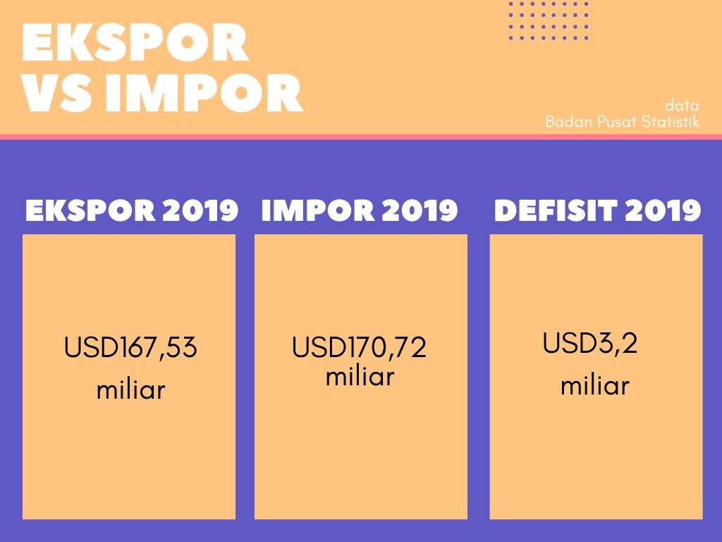 Dari laporan tersebut, ekspor 2019 tercatat sebesar USD167,53 miliar dan impor sebesar USD170,72 miliar, yang menjadi biang keroknya defisit neraca perdagangan Indonesia adalah tingginya impor migas mencapai USD9,3 miliar atau setara dengan Rp127,4 triliun.