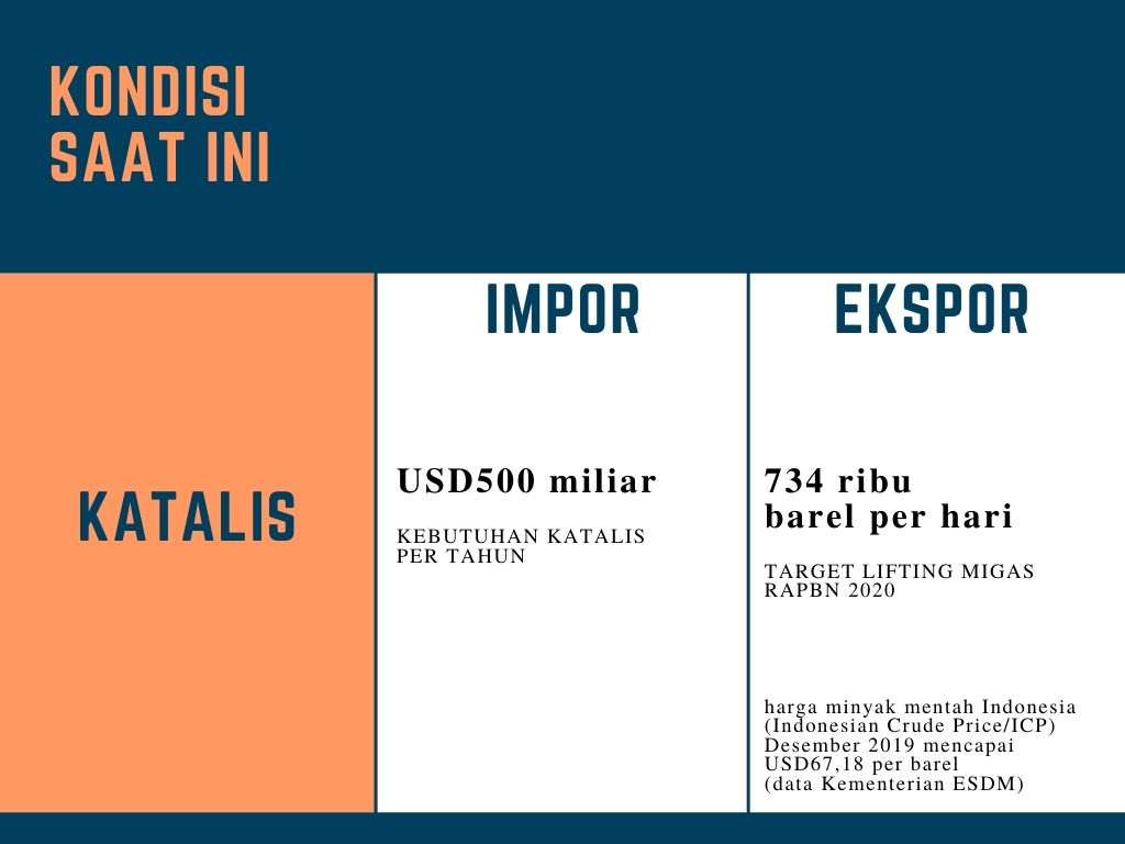 Untuk mempercepat produksinya, Pertamina perlu sekitar 50 katalis. Tetapi baru tiga yang mampu diproduksi di dalam negeri, sisanya di peroleh dari impor.