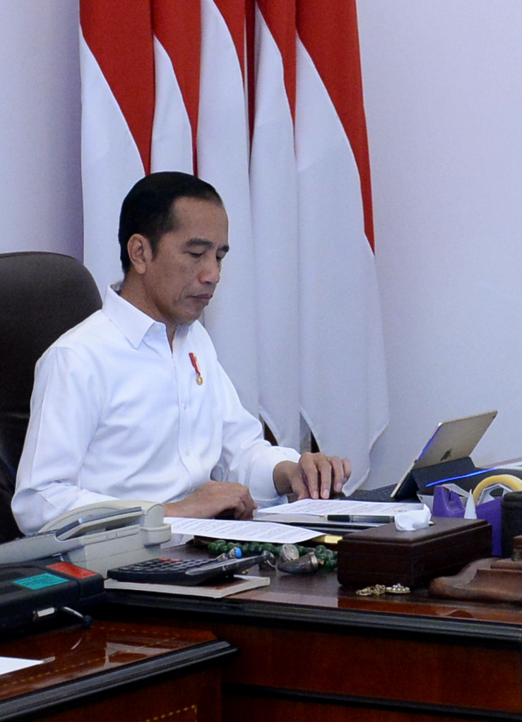 Presiden Joko Widodo memimpin rapat terbatas membahas kebijakan moneter dan fiskal menghadapi dampak ekonomi pandemi global Covid-19 melalui telekonferensi dari Istana Merdeka, Jakarta, pada Jumat, 20 Maret 2020. FOTO: BIRO PERS SETPRES