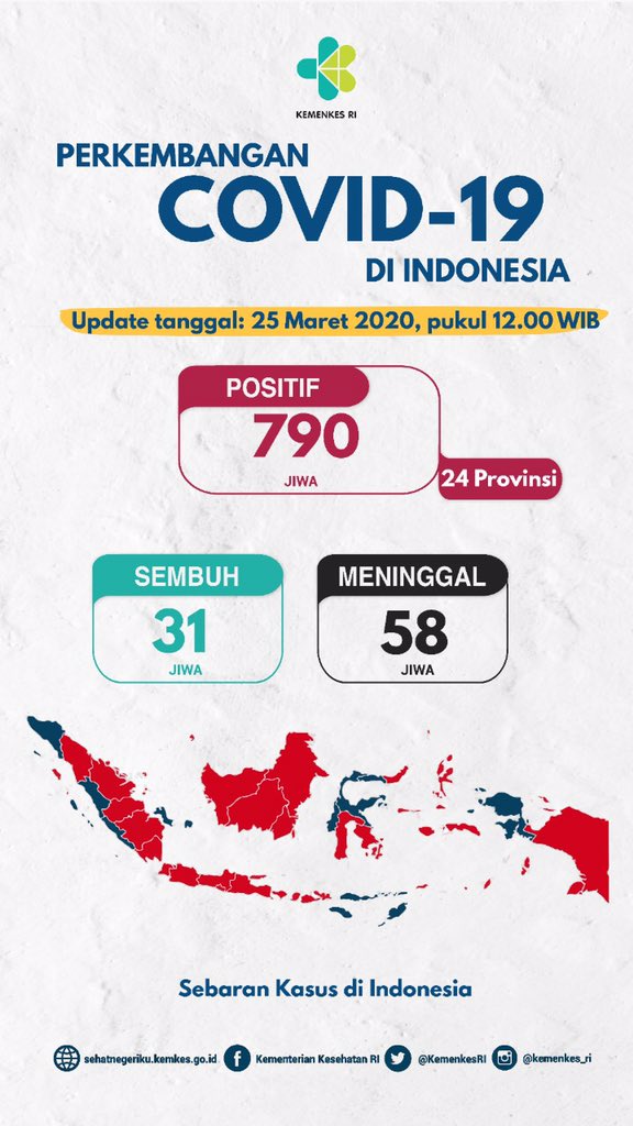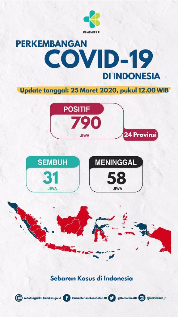 (Vibizmedia – Nasional) Update pertambahan kasus terkonfirmasi positif Covid-19 telah diumumkan kembali oleh Juru Bicara Pemerintah untuk Penangan Covid-19, dr. Achmad Yurianto, di Graha BNPB hari ini (25/3), penghitungan dilakukan dari tanggal 24/3/2020 hingga 25/3/2020 sebagai berikut: