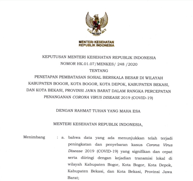 Selain itu, berdasarkan hasil kajian epidemiologi dan pertimbangan kesiapan daerah dalam aspek sosial, ekonomi, serta aspek lainnya, perlu dilaksanakan Pembatasan Sosial Berskala Besar di wilayah Kabupaten Bogor, Kota Bogor, Kota Depok, Kabupaten Bekasi, dan Kota Bekasi, Provinsi Jawa Barat, guna menekan penyebaran Covid-19 semakin meluas.