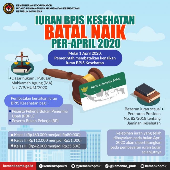 (Vibizmedia – Nasional) Mulai 1 April 2020, Pemerintah telah melaksanakan Putusan Mahkamah Agung (MA) No. 7/P/HUM/2020 yang membatalkan kenaikan iuran jaminan kesehatan bagi Peserta Pekerja Bukan Penerima Upah (PBPU) dan Peserta Bukan Pekerja (BP) Badan Penyelenggara Jaminan Sosial (BPJS) Kesehatan.