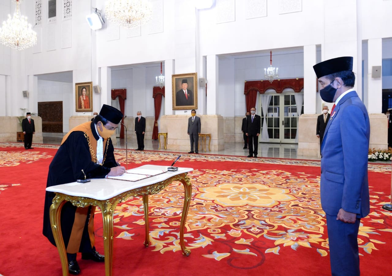Presiden Joko Widodo menyaksikan pengucapan sumpah jabatan Ketua Mahkamah Agung Syarifuddin, yang berlangsung di Istana Negara, Kamis 30 April 2020. FOTO: BIRO PERS SETPRES