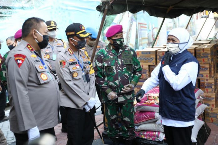 Bersama Kapolda Jawa Timur Irjen Pol Luki Hermawan dan Pangdam V Brawijaya Mayjend TNI Widodo Iryansyah, Gubernur Khofifah meninjau kesiapan makanan siap saji yang akan didistribusikan untuk buka puasa bagi masyarakat terdampak covid-19 di sekitar Makodam V Brawijaya.