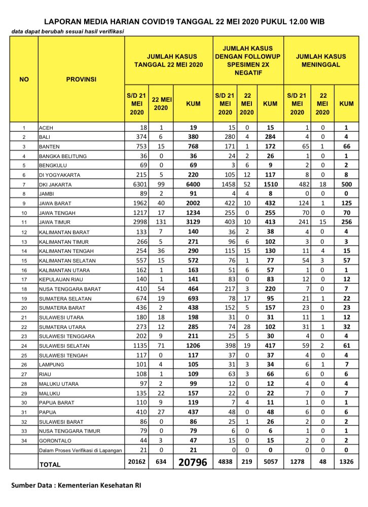 Hingga tanggal 22 Mei 2020   maka berikut akumulatif daftar jumlah penderita positif di seluruh provinsi :