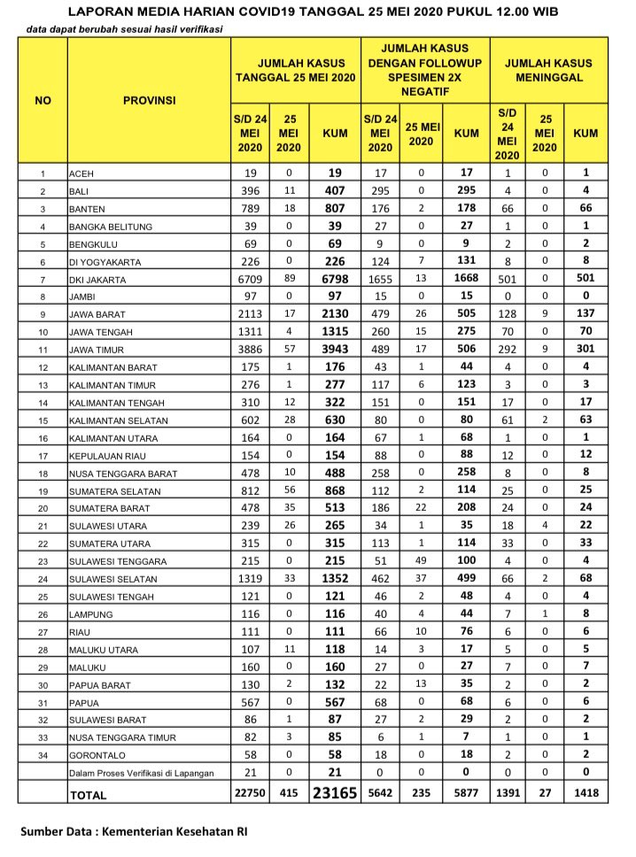 Hingga tanggal 26 Mei 2020 maka berikut akumulatif daftar jumlah penderita positif di seluruh provinsi :