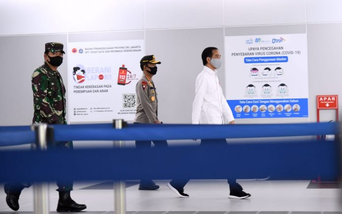 “Pagi hari ini, saya datang ke stasiun MRT dalam rangka untuk memastikan bahwa mulai hari ini (Selasa), akan digelar oleh TNI dan Polri pasukan untuk berada di titik-titik keramaian dalam rangka mendisiplinkan, lebih mendisiplinkan, masyarakat agar mengikuti protokol kesehatan sesuai dengan PSBB,” ungkap Presiden Joko Widodo.