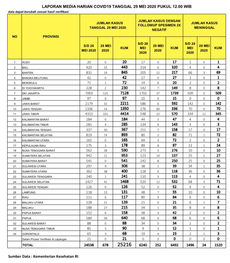 Hingga tanggal 29 Mei 2020 maka berikut akumulatif daftar jumlah penderita positif di seluruh provinsi :