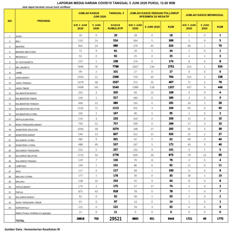 Hingga tanggal 5 Juni 2020 maka berikut akumulatif daftar jumlah penderita positif di seluruh provinsi :