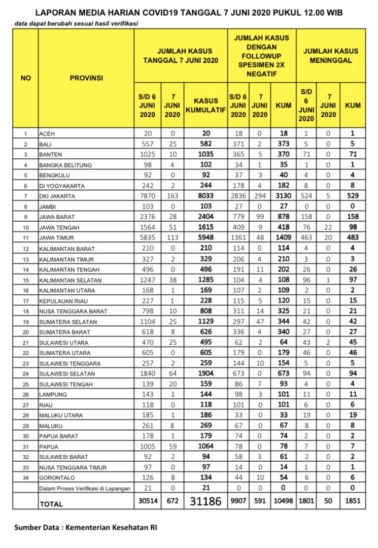 Hingga tanggal 7 Juni 2020 maka berikut akumulatif daftar jumlah penderita positif di seluruh provinsi :