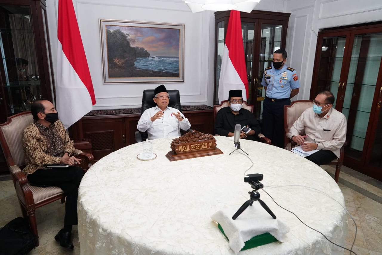 Wapres K.H. Ma’ruf Amin ketika memberikan keterangan pers kepada media melalui teleconference di kediaman dinas Wapres, Jalan Diponegoro Nomor 2, Jakarta Pusat, Senin sore (08/06/2020). (Foto: KIP SETWAPRES)