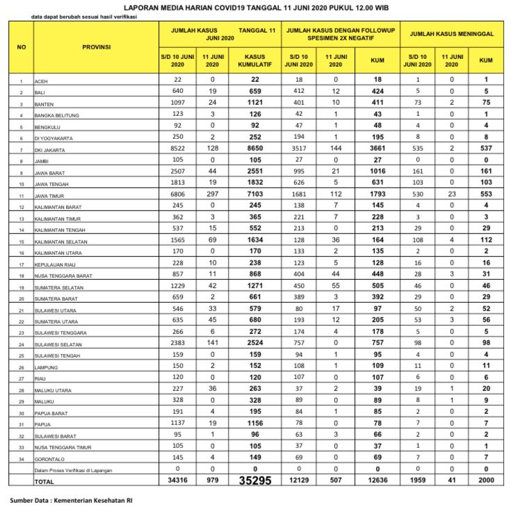 Hingga tanggal 11 Juni 2020 maka berikut akumulatif daftar jumlah penderita positif di seluruh provinsi :