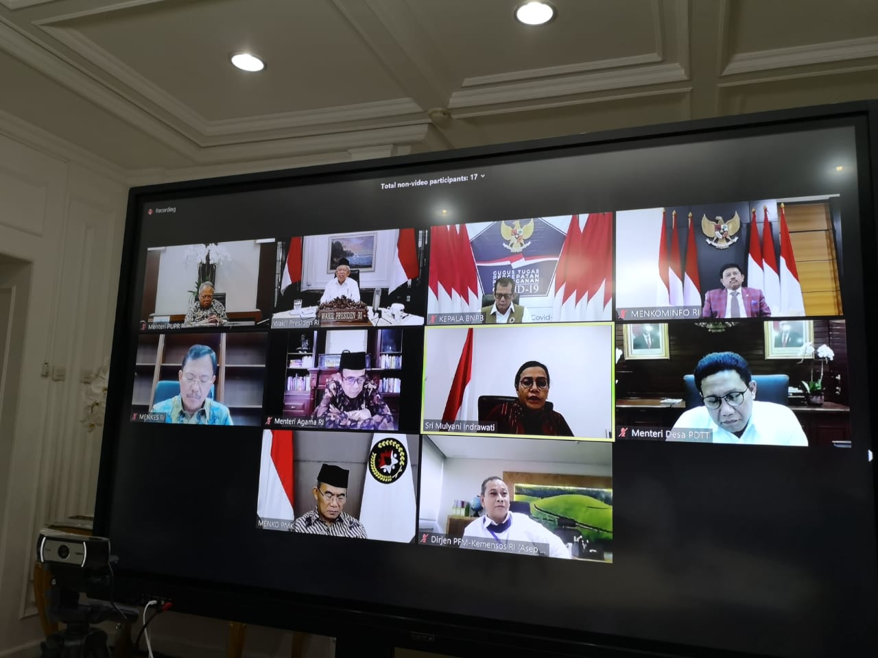 Hadir dalam rapat virtual ini Menteri Keuangan Sri Mulyani Indrawati, Menteri Koordinator Bidang Pembangunan Manusia dan Kebudayaan Muhadjir Effendy, Menteri Agama Fachrul Razi, Menteri Kesehatan Terawan Agus Putranto, Menteri Desa, Pembangunan Daerah Tertinggal dan Transmigrasi Abdul Halim Iskandar, Menteri Pekerjaan Umum dan Perumahan Rakyat Basuki Hadimuljono, Menteri Komunikasi dan Informatika Johnny G. Plate dan Kepala Gugus Tugas Penanganan Covid-19 Doni Monardo.
