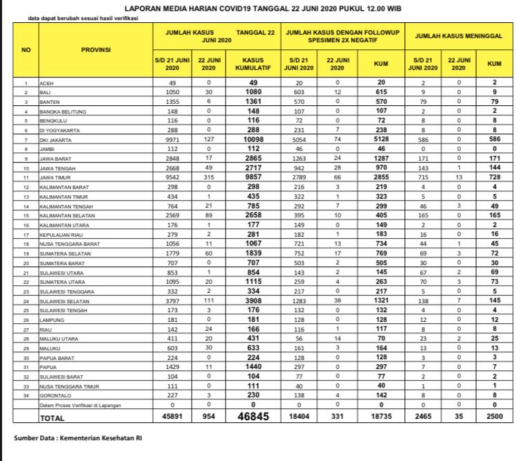 Hingga tanggal 22  Juni 2020   maka berikut akumulatif daftar jumlah penderita positif di seluruh provinsi :