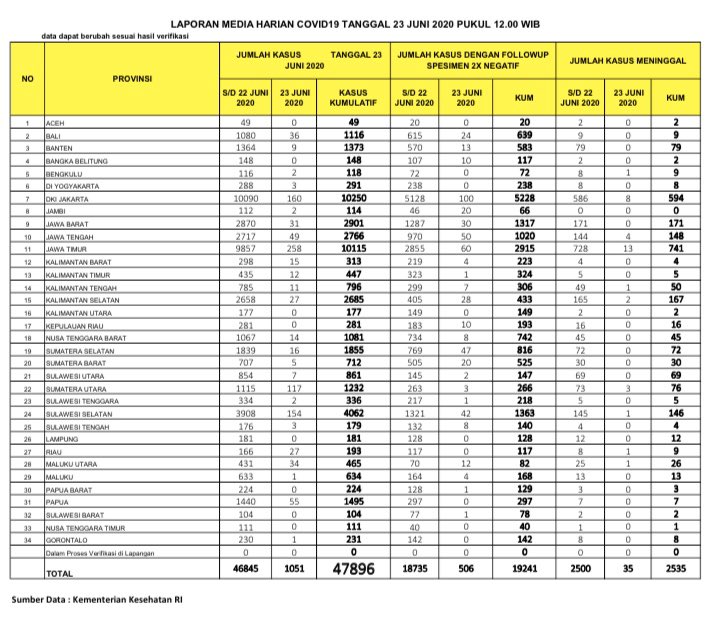 Hingga tanggal 23 Juni 2020 maka berikut akumulatif daftar jumlah penderita positif di seluruh provinsi :