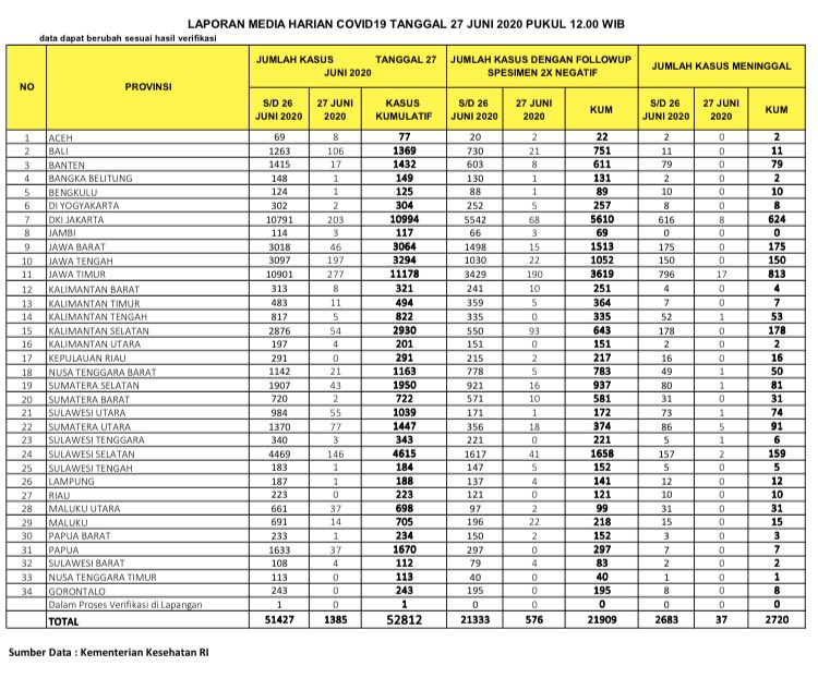 Hingga tanggal 27 Juni 2020 maka berikut akumulatif daftar jumlah penderita positif di seluruh provinsi :