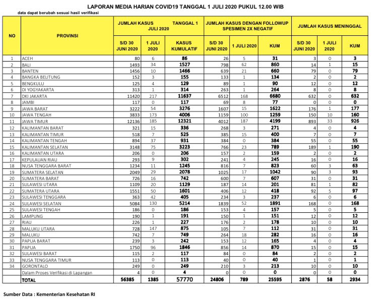 Hingga tanggal 1 Juli 2020 maka berikut akumulatif daftar jumlah penderita positif di seluruh provinsi :