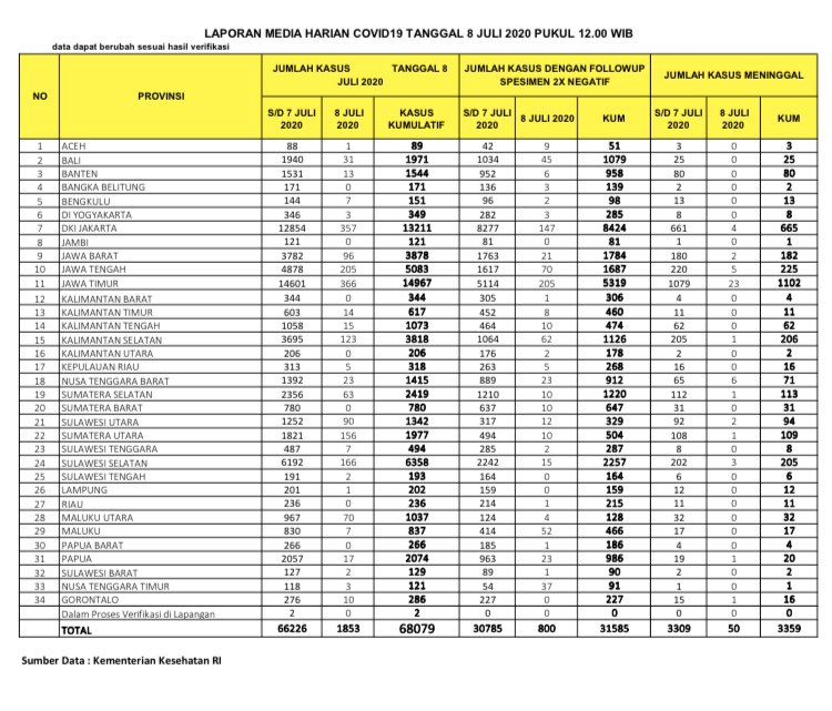 Hingga tanggal 8 Juli 2020 maka berikut akumulatif daftar jumlah penderita positif di seluruh provinsi :