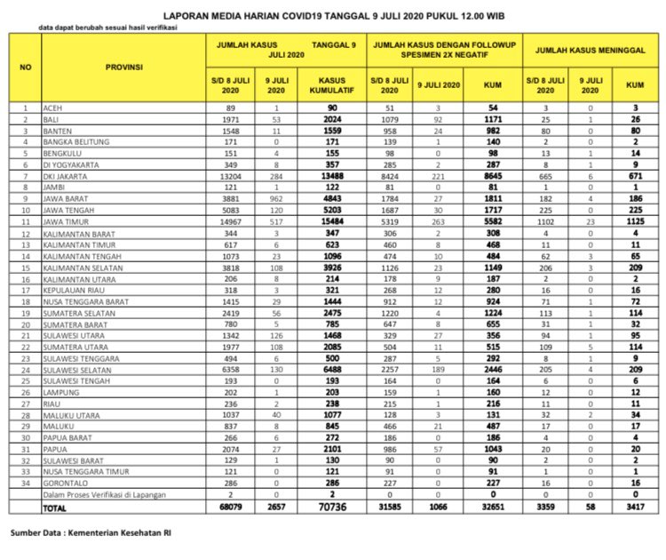 Hingga tanggal 9 Juli 2020 maka berikut akumulatif daftar jumlah penderita positif di seluruh provinsi :