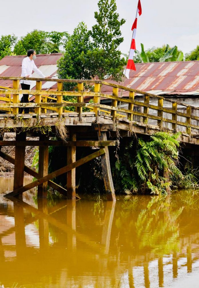 Presiden didampingi Menteri Pekerjaan Umum dan Perumahan Rakyat Basuki Hadimuljono, Menteri Pertanian Syahrul Yasin Limpo, Menteri Pertahanan Prabowo Subianto, dan Gubernur Kalimantan Tengah Sugianto Sabran melihat proses pembangunan dari atas jembatan kayu.