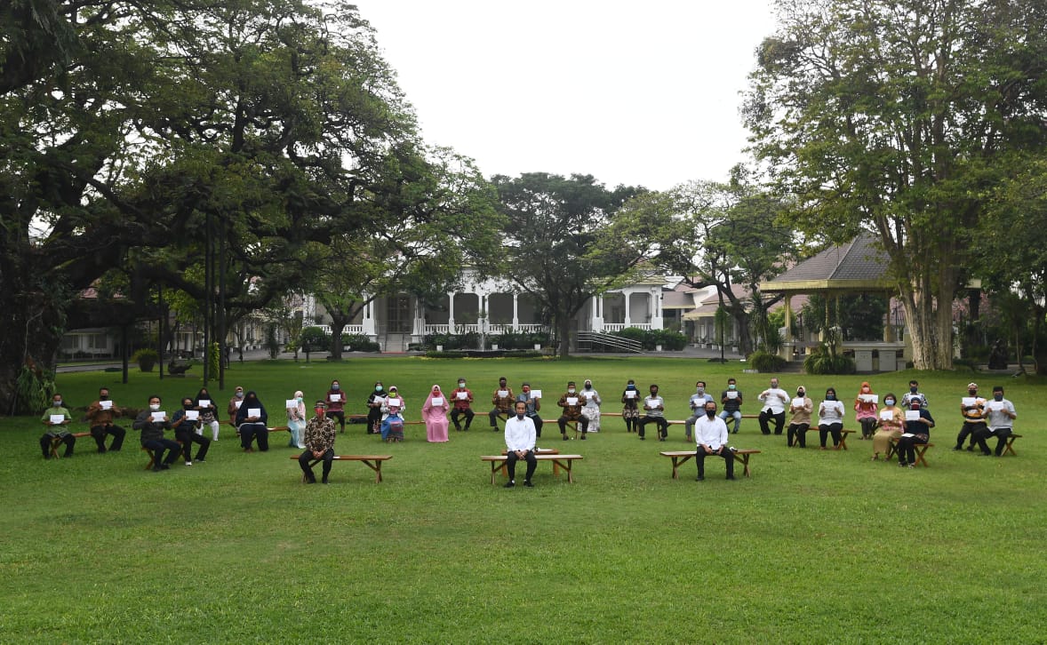 Untuk diketahui, penyerahan bantuan modal kerja tersebut dilakukan dalam dua sesi pada hari ini. Sebanyak 30 penerima bantuan modal kerja dari berbagai wilayah administrasi di DKI Jakarta hadir dan menerima secara langsung bantuan tersebut pada setiap sesinya sebagai upaya mematuhi protokol kesehatan dengan menjaga jarak dan mencegah kerumunan yang terlalu banyak. Para penerima bantuan tersebut juga telah melalui proses pemeriksaan kesehatan sebelum memasuki kompleks Istana Kepresidenan.