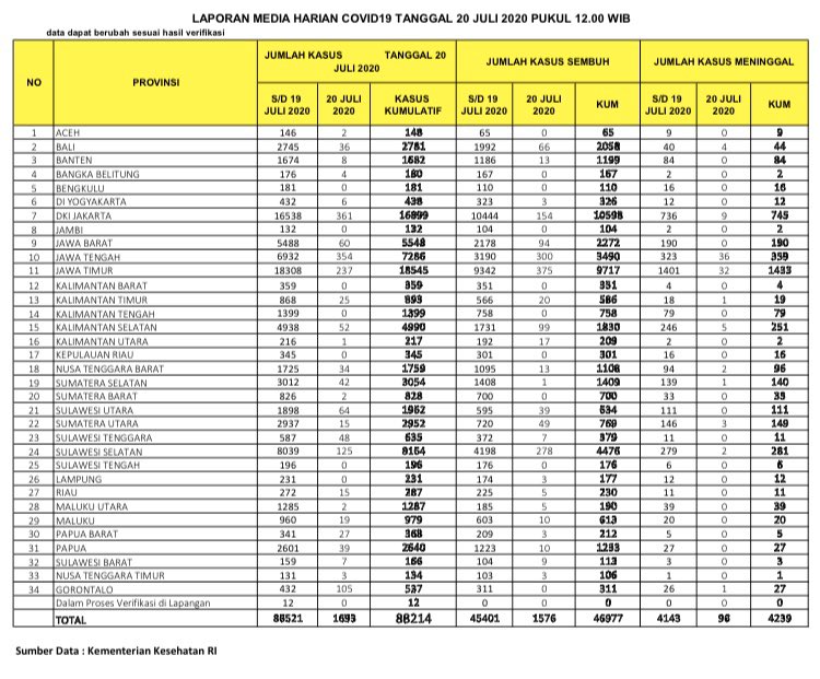 Berikut adalah data COVID-19 di seluruh provinsi pada tanggal 20 Juli 2020: