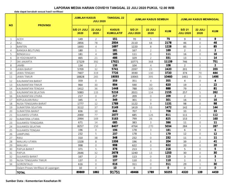 Berikut adalah data COVID-19 di seluruh provinsi pada tanggal 22 Juli 2020: