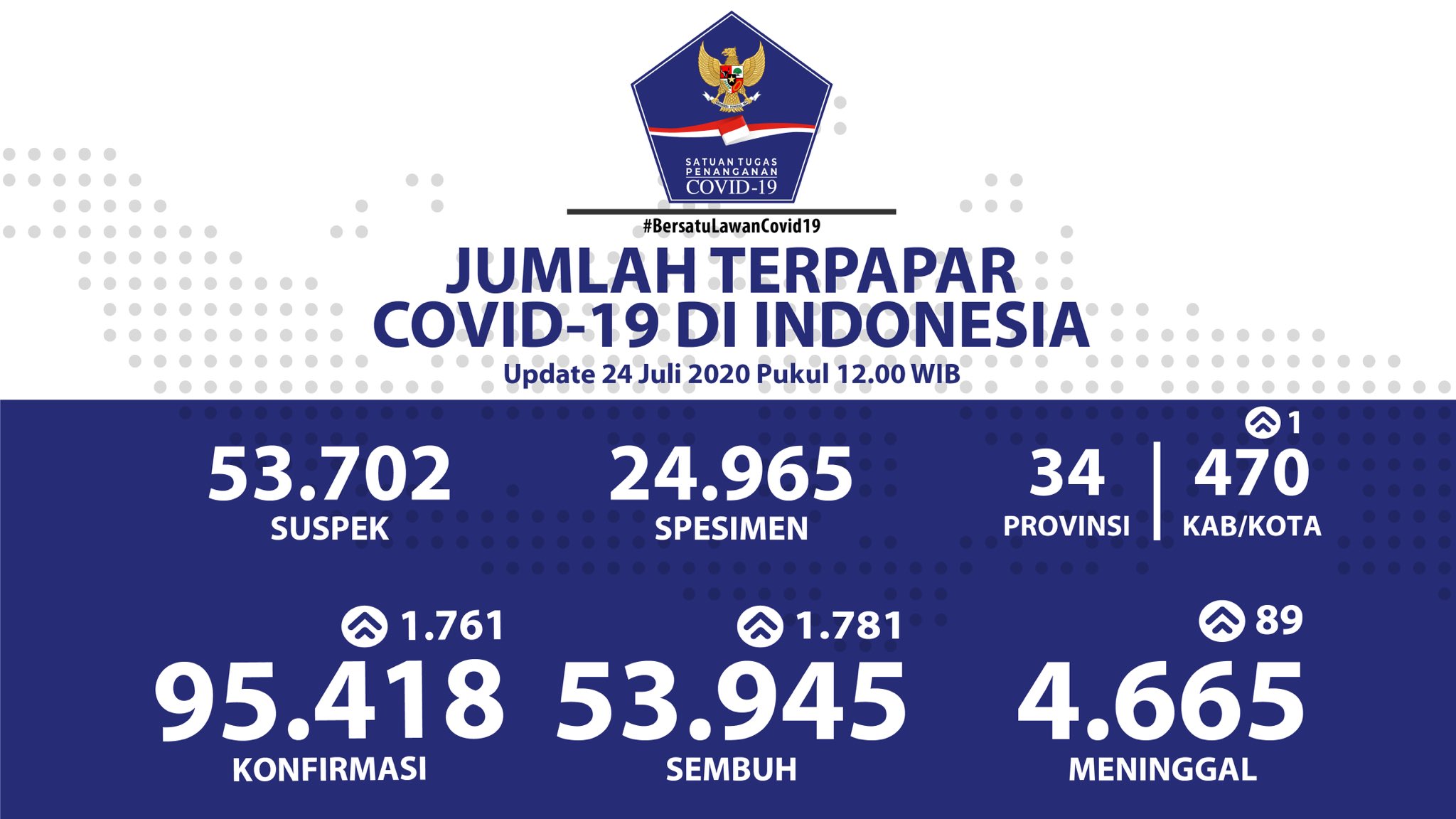 Vibizmedia – Nasional) Berikut adalah angka akumulatif perkembangan data kasus Covid-19 dari seluruh Indonesia hingga tanggal 24 Juli 2020.