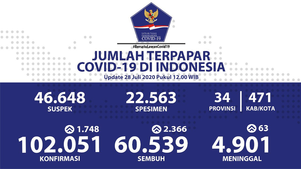 Breaking News Covid-19 di Indonesia 28 Juli 2020: Bertambah 1.748 , Total Positif Kini 102.051