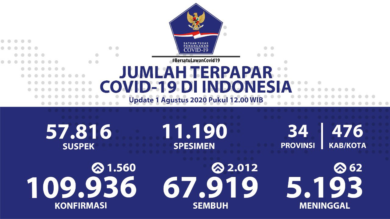 Breaking News Covid-19 di Indonesia 1 Agustus 2020: Bertambah 1.560 , Total Positif Kini 109.936