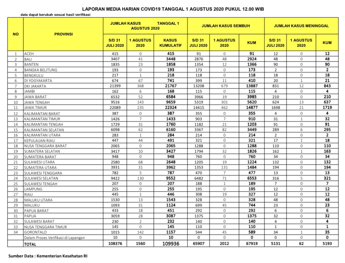 Berikut adalah data COVID-19 di seluruh provinsi pada tanggal 1 Agustus 2020: