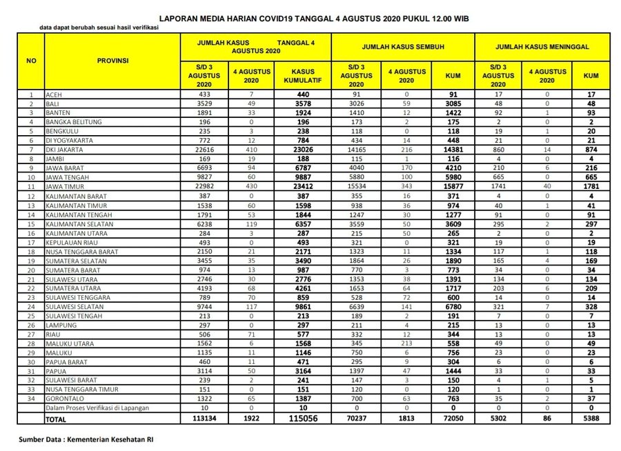 Berikut adalah data COVID-19 di seluruh provinsi pada tanggal 4 Agustus 2020:
