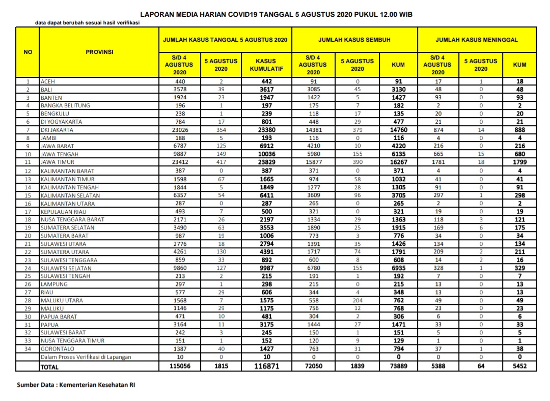 Berikut adalah data COVID-19 di seluruh provinsi pada tanggal 5 Agustus 2020: