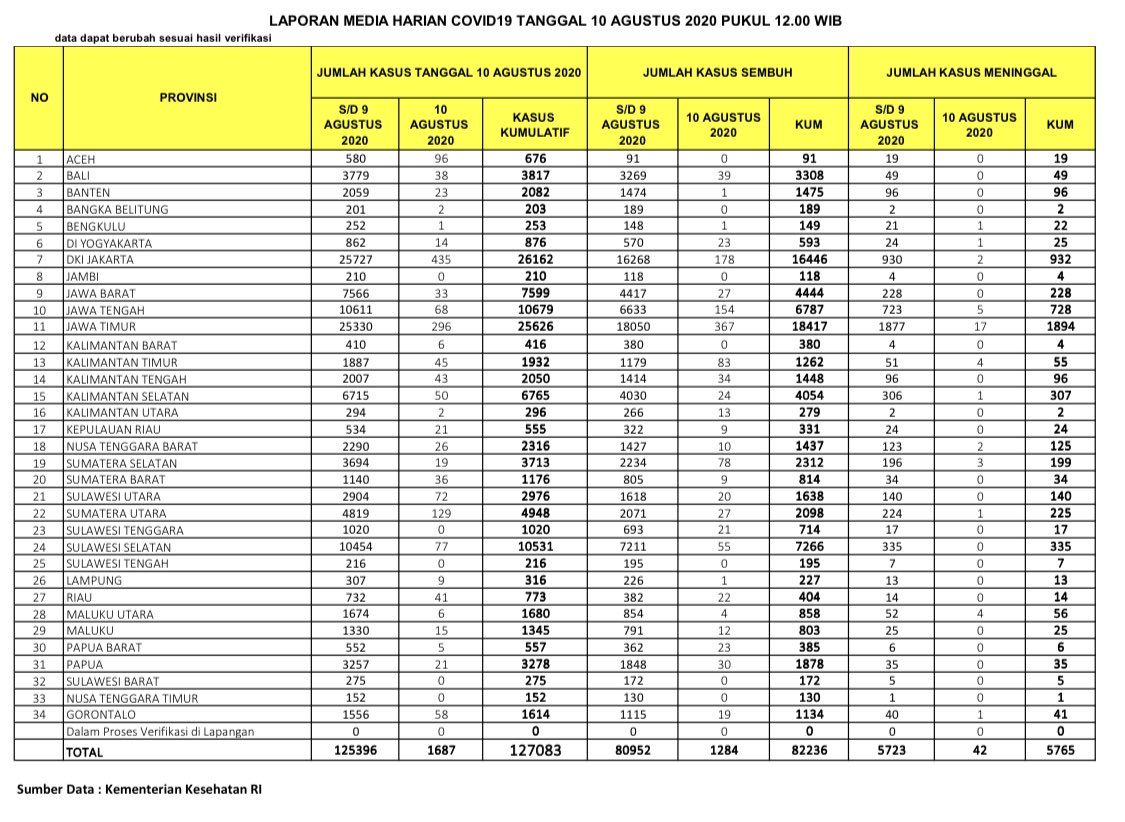 Berikut adalah data COVID-19 di seluruh provinsi pada tanggal 10 Agustus 2020: