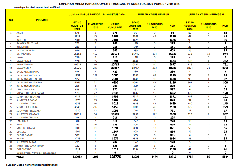 Berikut adalah data COVID-19 di seluruh provinsi pada tanggal 11 Agustus 2020: