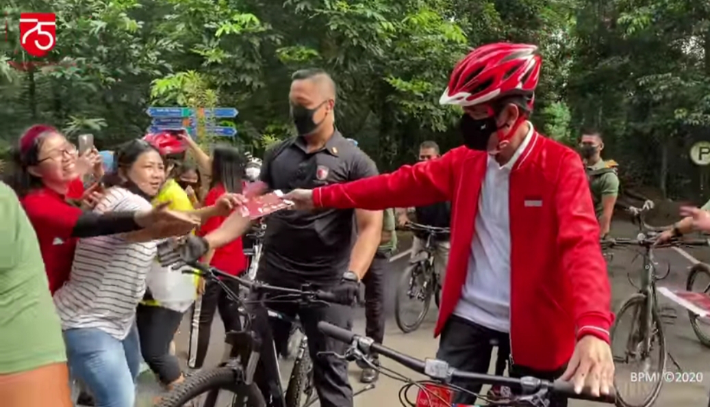 Presiden tampak mengenakan jaket olahraga warna merah, lengkap dengan masker, dan helm sepeda. Ditemani putra bungsunya, Kaesang Pangarep, dan sejumlah Paspampres, Presiden mulai mengayuh sepedanya menuju Kebun Raya Bogor.
