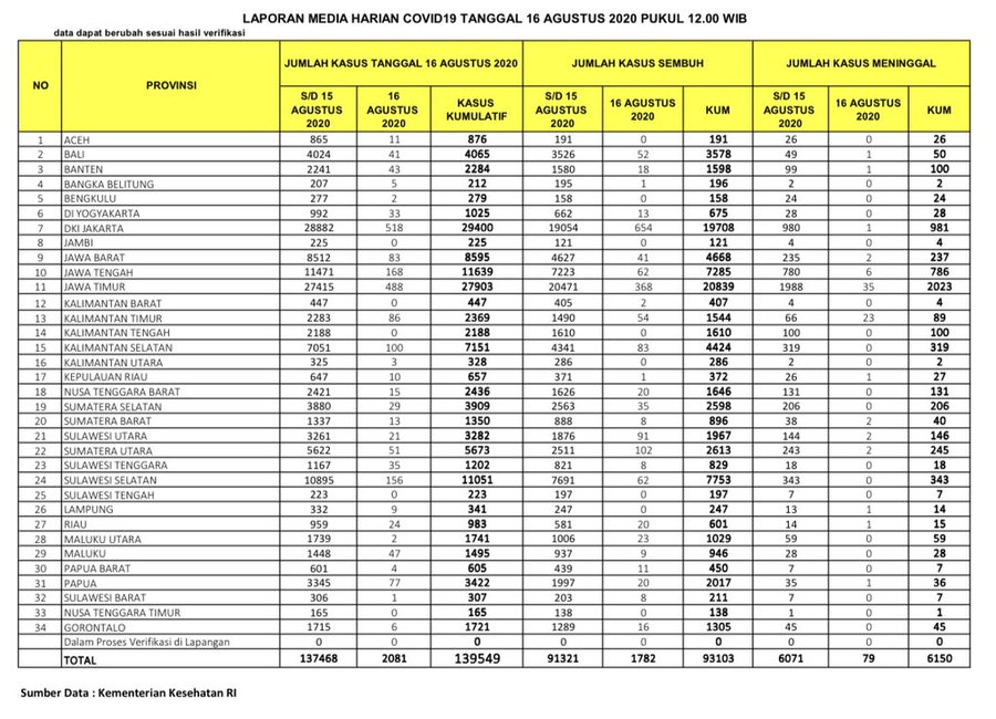 Berikut adalah data COVID-19 di seluruh provinsi pada tanggal 16 Agustus 2020: